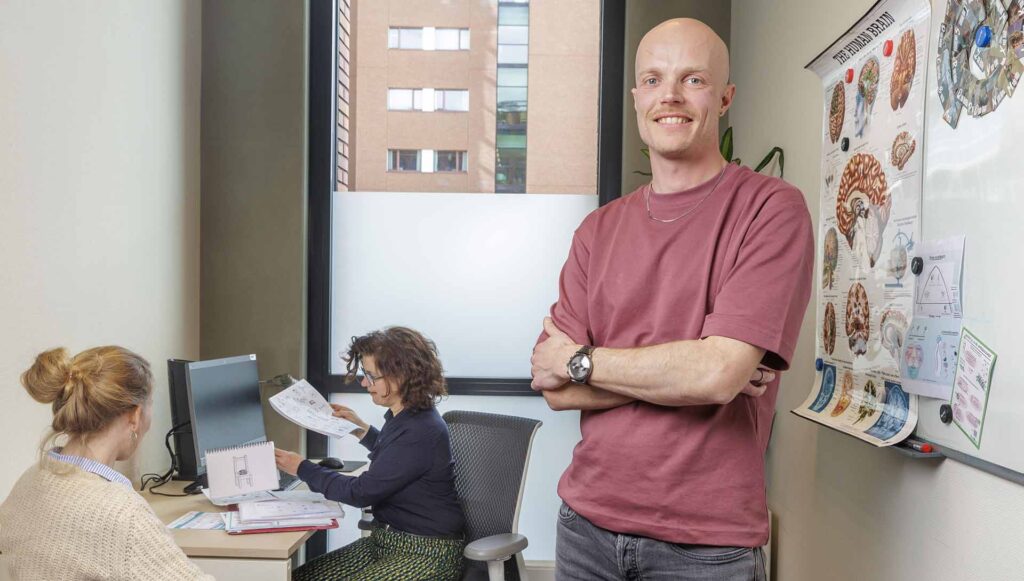 Prettige bijkomstigheid aan het specialisme: er is sprake van een goede werk-privébalans. Wouter: ‘Hoewel je soms avond- en weekenddiensten hebt, is je werk doorgaans goed te plannen – tijd voor een hobby of je gezin is er dus zeker. Maar het schept ook ruimte voor nevenactiviteiten: zo geef ik lezingen bij alzheimercafés en hoop ik in de toekomst ook wat op organisatieniveau te kunnen doen.’ Een nadeel vindt Wouter lastig te bedenken. ‘Ja, misschien het feit dat je soms tegen de grenzen van de zorg aanloopt. Door personeelstekort lukt het niet altijd om alle disciplines rondom een patiënt aan tafel te krijgen. Lastig, want je kunt daardoor niet het volledige beeld van een patiënt vormen en wat de behandelmogelijkheden zijn.’